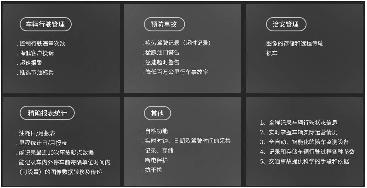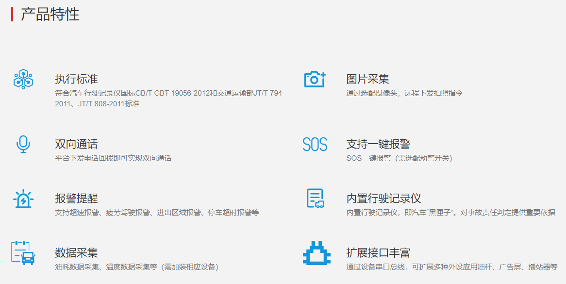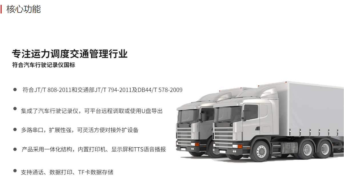 • 产品概述:产品符合汽车行驶记录仪国标GB/T GBT 19056-2012和交通运输部JT/T 794-2011、JT/T 808-2011标准