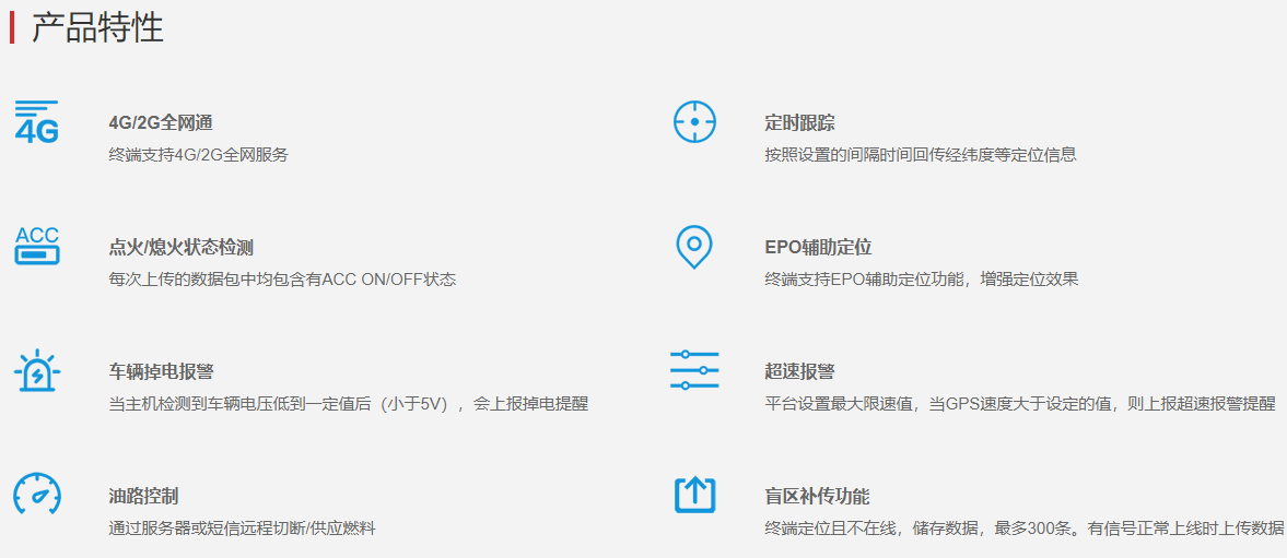 • 产品描述:9~90V的宽电压范围,适用于各类车辆,搭配稳定的全球定位服务平台,实现远程车辆管理,为车辆提供全天候管理